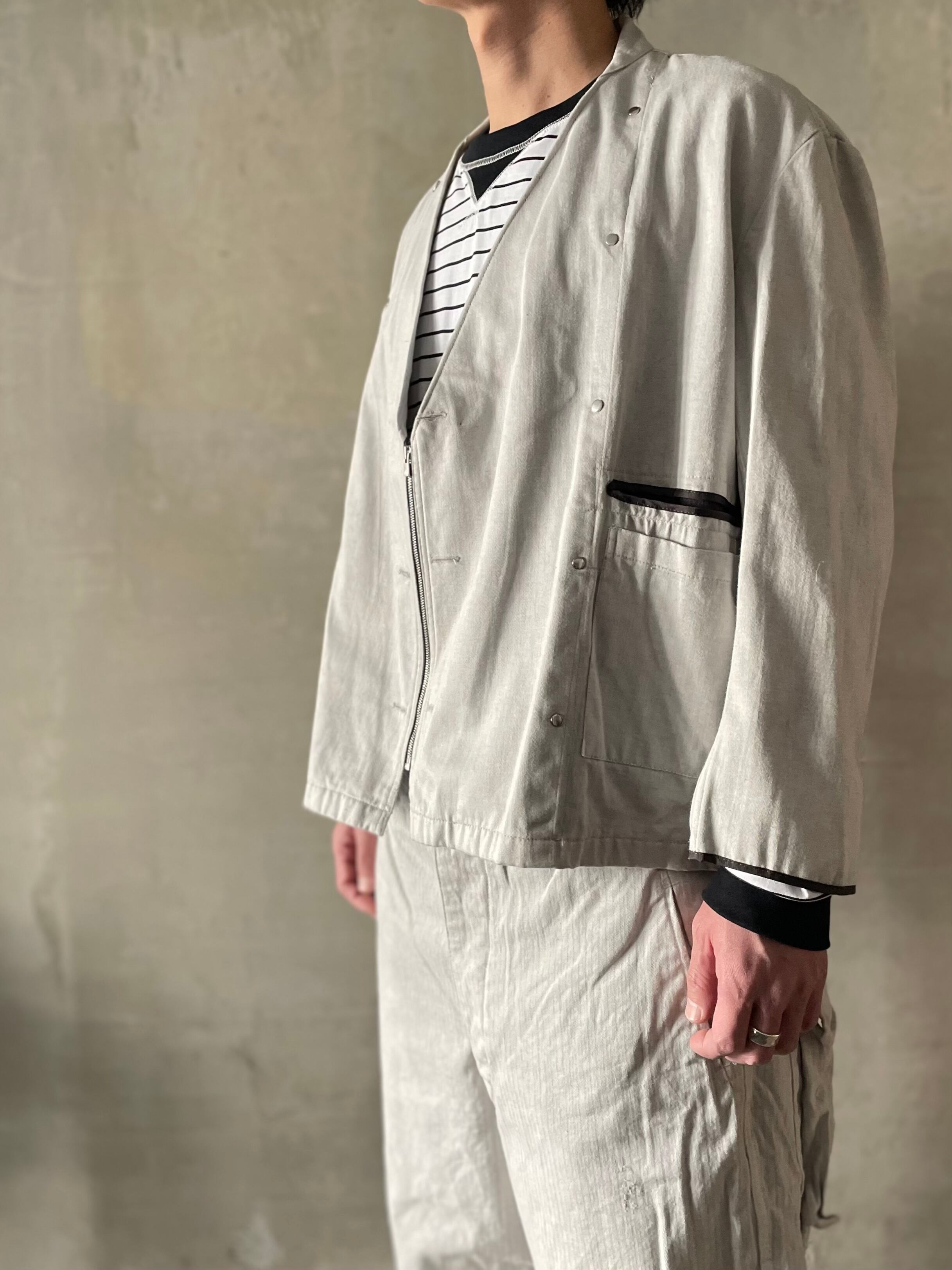TrAnsference zip collarless cook jacket